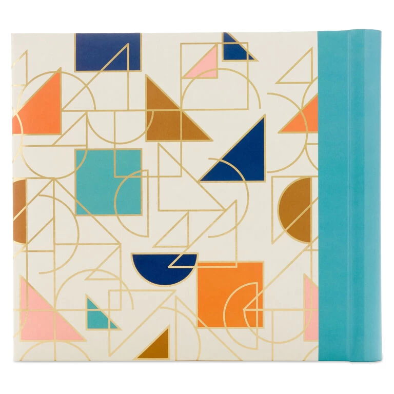 Collect pictures of special moments, vacations, birthday parties and more in this fun photo album featuring colored squares, triangles and half-circles with gold-foil overlay designs on a white background. 100-page album holds two 4×6 photographs on each page, with journaling lines alongside for captions and notes.
