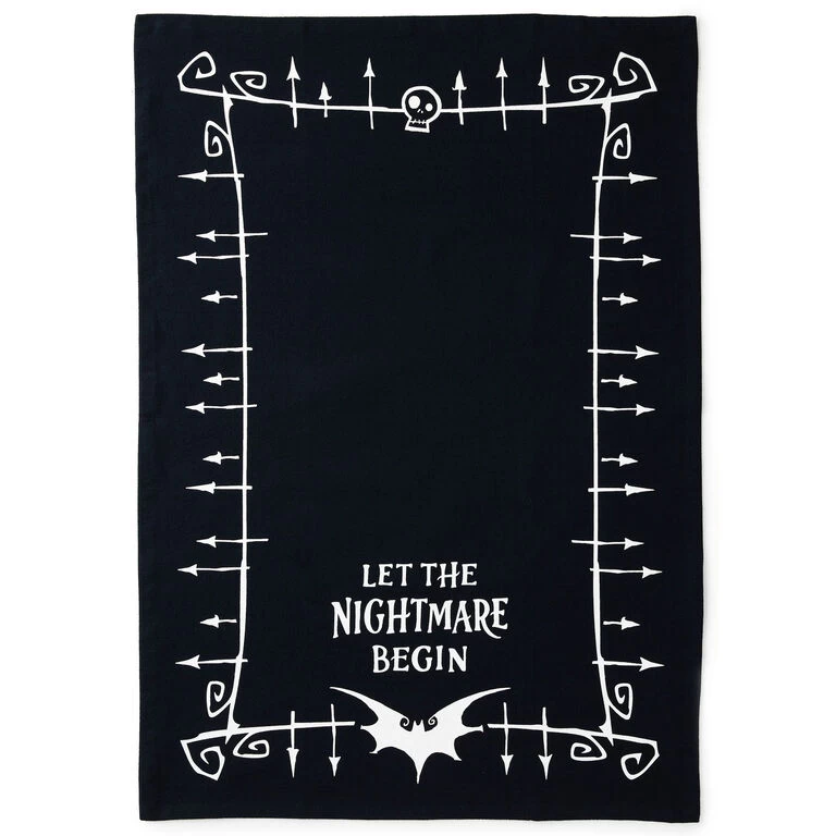 • Disney Tim Burton’s “The Nightmare Before Christmas” cotton tea towel features a printed design of an iron cemetery fence and a spooky quote.