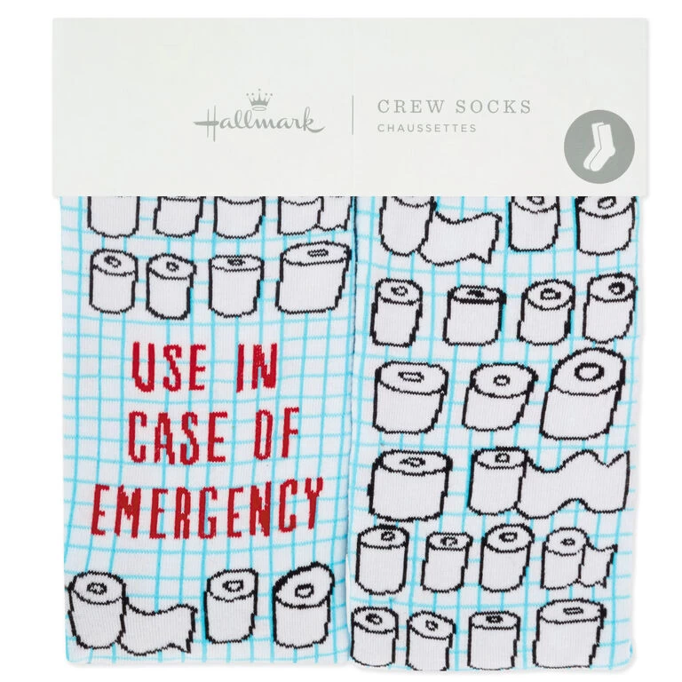 - Novelty crew socks feature a design of toilet paper rolls and a funny message.