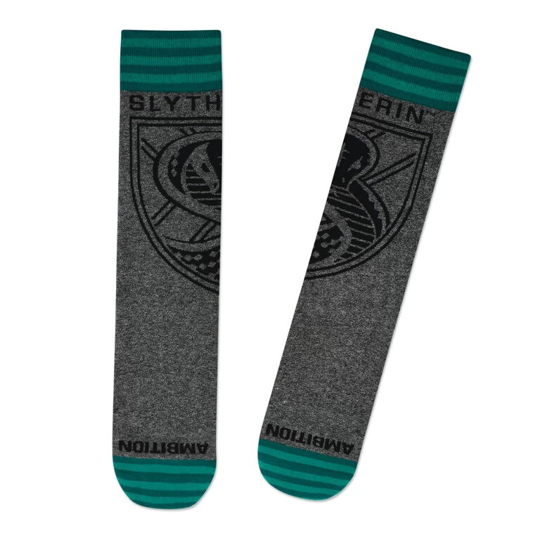 - Harry Potter gray crew socks feature a Slytherin house crest design and green striped accents.