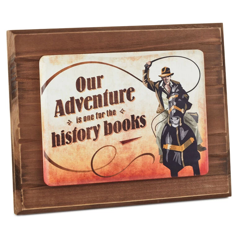 Display this layered wood sign with a fun Indiana Jones theme on a tabletop or shelf. This rustic, decorative quote sign features an action-packed illustration of Indy on horseback and makes a great gift for your significant other as a testament to your adventures together.